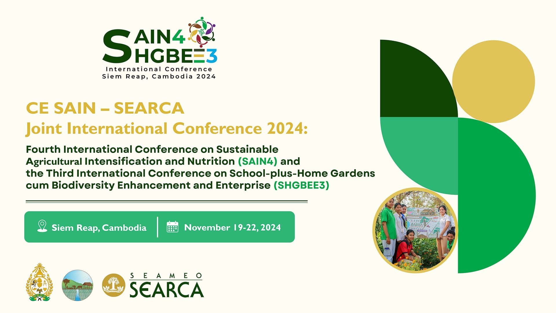 The Center of Excellence on Sustainable Agricultural Intensification and Nutrition (CE SAIN) and the Southeast Asian Regional Center for Graduate Study and Research in Agriculture (SEARCA) are organizing the CE SAIN – SEARCA Joint International Conference 2024: Fourth International Conference on Sustainable Agricultural Intensification and Nutrition (SAIN4) and the Third International Conference on School-plus-Home Gardens cum Biodiversity Enhancement and Enterprise (SHGBEE3) on 19-22 November 2024 in Siem Reap, Cambodia. The conference aims to foster knowledge exchange, collaboration, and innovation focused on sustainable agriculture, nutrition, and biodiversity in the community. The SAIN4 and SHGBEE3 Conference will feature a dynamic blend of networking such as keynote speeches, plenary sessions, parallel sessions, oral and poster presentations, and mobile workshops at agricultural technology parks, farms, and biodiversity conservation areas in Angkor Wat.