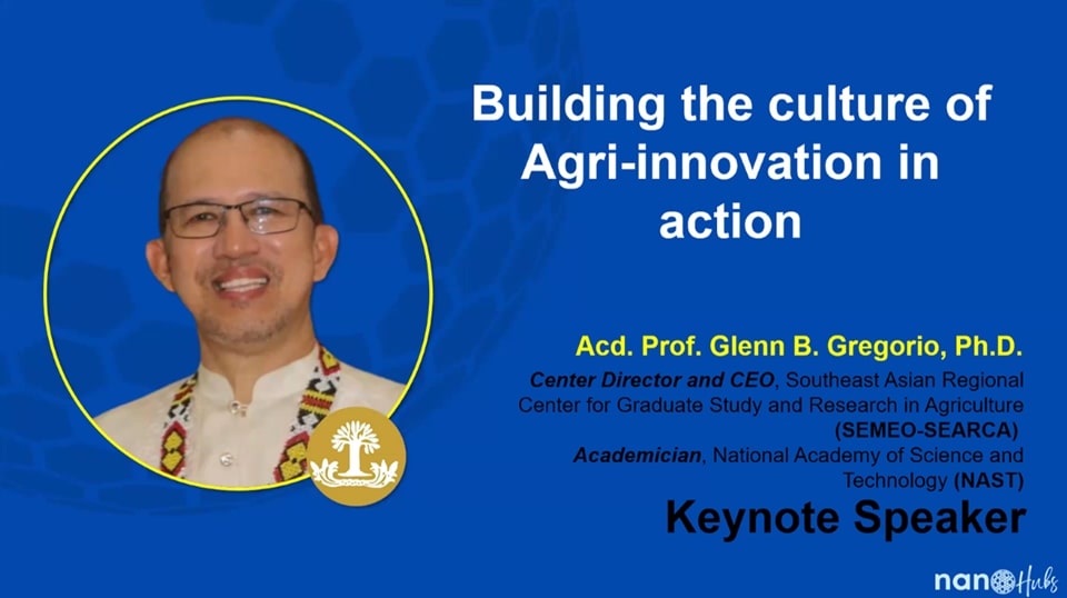 Dr. Glenn Gregorio, Southeast Asian Regional Center for Graduate Study and Research in Agriculture (SEARCA) Director and National Academy of Science and Technology, Philippines (NAST PHL) Academician, reinforced the need to build a culture of agri-innovation in action among the Filipino youth in the Sixth Session of the Webinar Series on Nanotechnology titled “Empowering Young Filipino Researchers for an Emerging Technology Ready Philippines,” organized by the Philippine Department of Science and Technology Philippine Council for Industry, Energy, and Emerging Technology Research and Development (DOST-PCIEERD) on 20 January 2023.