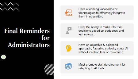 As a strategy, he said that administrators must understand AI's capabilities and limitations to effectively integrate it into the school environment. He suggested establishing a schoolwide or classroomwide AI policy with clear guidelines and protocols, defining when and how AI is used. As an example, he proposed three types on AI use in the classroom: (1) unrestricted use, wherein students may freely use AI tools without limitations; (2) conditional use, wherein students are allowed to use AI tools under specific conditions, such as requiring prior approval from the teacher or mandatory acknowledgement of use; and (3) prohibited use, wherein students are entirely disallowed to use AI tools in any capacity.