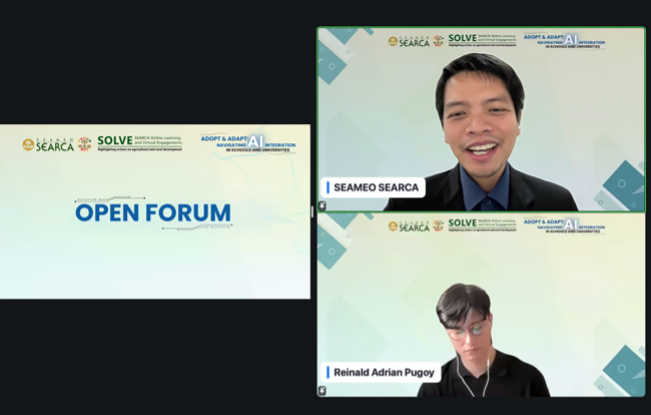 The 49th SEARCA Online Learning and Virtual Engagements (SOLVE) webinar held on 17 March 2025 featured Dr. Reinald Adrian Pugoy, who discussed artificial intelligence's (AI) transformative role in education in his talk, "Adopt & Adapt: Navigating AI Integration in Schools and Universities."