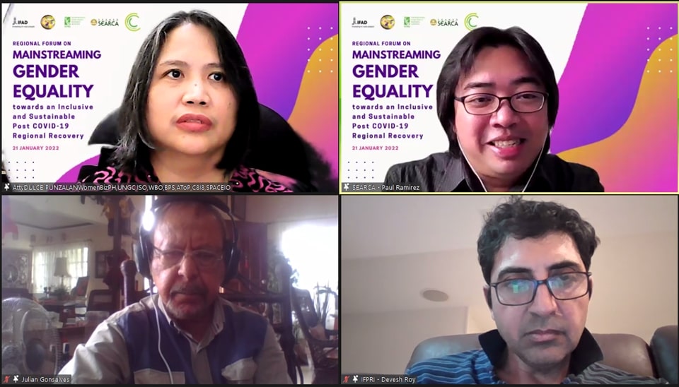 The International Fund for Agricultural Development (IFAD)-funded project, Agricultural Transformation and Market Integration in the ASEAN Region: Responding to Food Security and Inclusiveness Concerns (ATMI-ASEAN), and the IFAD Philippines Gender Network (IPGN) hosted a regional forum on “Mainstreaming Gender Equality towards an Inclusive and Sustainable Post-COVID 19 Regional Recovery” on 21 January 2022 via Zoom.