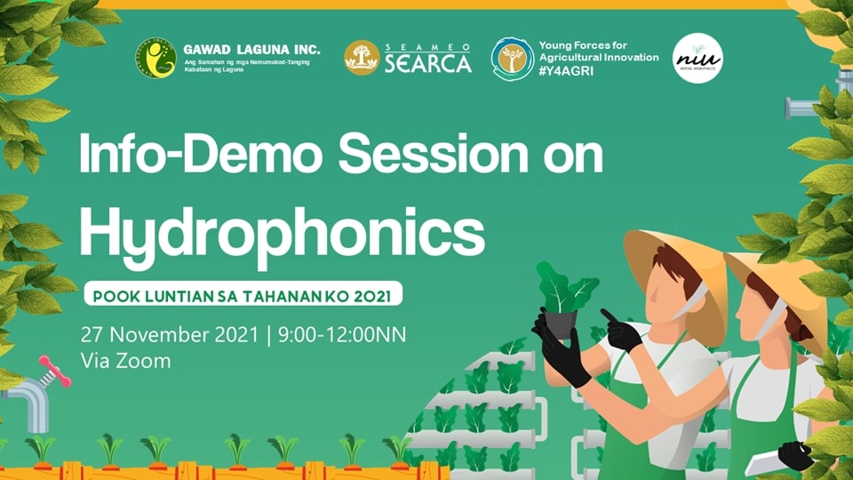 LAGUNA, Philippines – Young educators, students, and out-of-school youth from different districts of Laguna province joined the SEARCA-hosted Information and Demonstration Session on Hydroponics as part of the “Pook Luntian Sa Tahanan Ko” project of Gawad Laguna, Inc. (GLI) held on 27 November 2021 via Zoom.