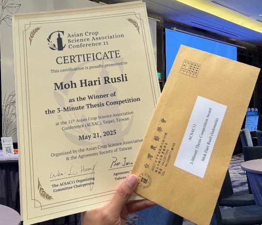 In this high-impact crop science conference, Mr. Rusli, who is pursuing his MS in Global Agriculture Technology and Genomic Science at NTU, delivered a compelling three-minute presentation summarizing his thesis titled "Exogenous supplementation of L-DOPA mitigates cadmium toxicity in rice (Oryza sativa 'Kitaake') via activation of distinct transcriptional pathway." His presentation stood out for its clarity, scientific merit, and public engagement, earning him the first-place award among participants from several academic institutions across Asia. The competition was part of a broader conference program aimed at enhancing young scientists' ability to communicate complex agricultural research effectively. Mr. Rusli received a certificate and a cash prizeof NTD 3,500 from the Agronomy Society of Taiwan, co-organizer of the conference.