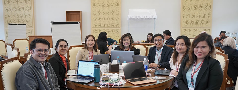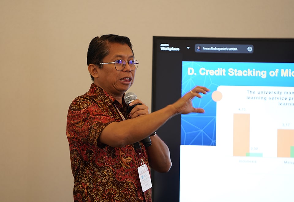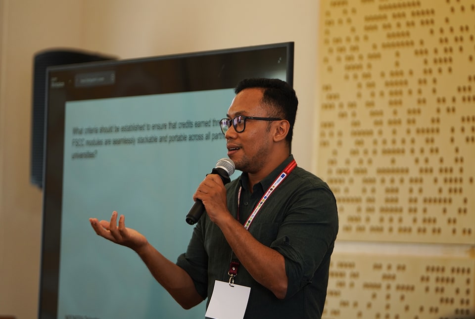 The workshop discussions were facilitated by Dr. Ir. Hatma Suryatmojo, Director of the Directorate for Academic Research and Innovation and UGM's UC Coordinator; Dr. Irwan Endrayanto Aluicius, Head of the Sub-Directorate for Academic Research; and Dr. Harry Freitag Luglio Muhammad, Manager of UGM Online. Participants collaborated in country-based groups to explore similarities and differences in credit recognition systems, establish timeframes for credit acknowledgment, and address module implementation, admission, and payment processes. On the second day, the discussions focused on finalizing the roadmap and defining shared processes for implementing the modules. Key aspects of micro-credentials were also tackled, such as recognition, certification, credential stacking, credit transfer, and the integration of digital badges for the 2025 PMC FSCC offering.