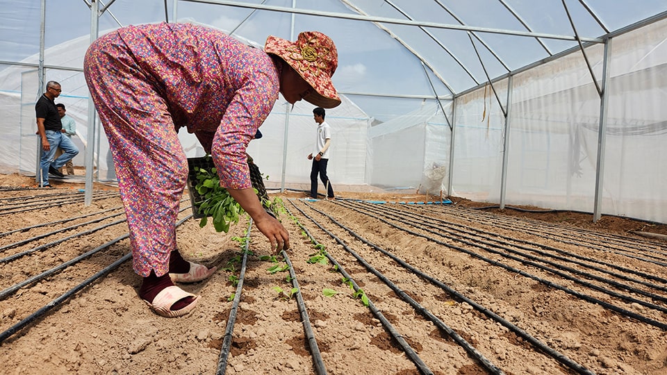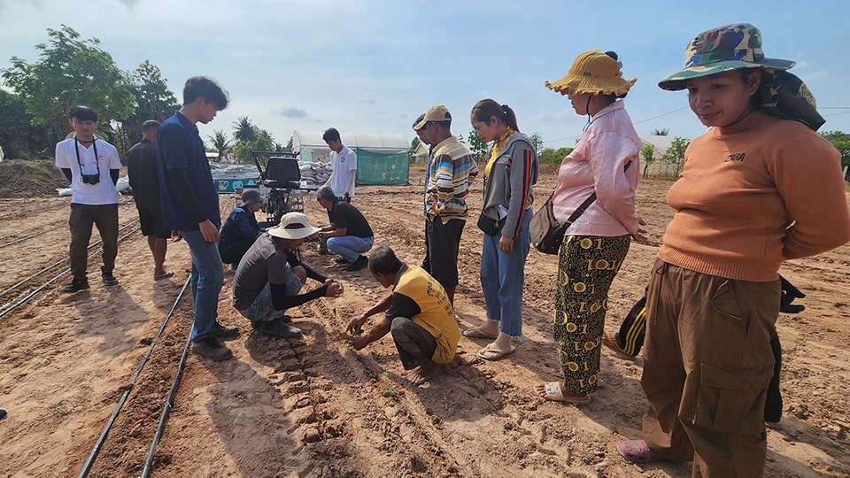 In May 2024, a knowledge-sharing event was held in Takeo Province, Cambodia, in partnership with the RUA. The event highlighted the introduction of a no-till vegetable transplanter powered by a two-wheel tractor, which was designed to reduce the labor required for vegetable planting. This innovative technology was showcased to net house vegetable planters, who had the opportunity to see its operation firsthand.