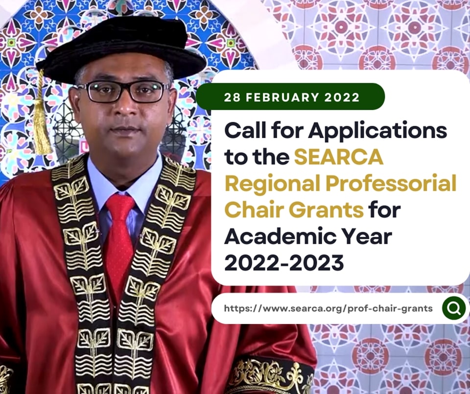 SEARCA, through the Education and Collective Learning Department (ECLD), announced its Call for Applications for the Regional Professorial Chair Grant for Academic Year 2022-2023. The grant recognizes outstanding Southeast Asian experts in the academe whose achievements have made great impact or contributions towards Accelerating Transformation Through Agricultural Innovation (ATTAIN), as applied towards SEARCA’s seven priority areas on Agri-Business Models for Increased Productivity and Income; Sustainable Farming Systems and Natural Resource Management; Food and Nutrition Security; Transformational Leadership for Agricultural and Rural Development (ARD); Gender and Youth Engagement in ARD; Enhanced ARD towards Climate Resilience; and EcoHealth/One Health Applications to ARD.