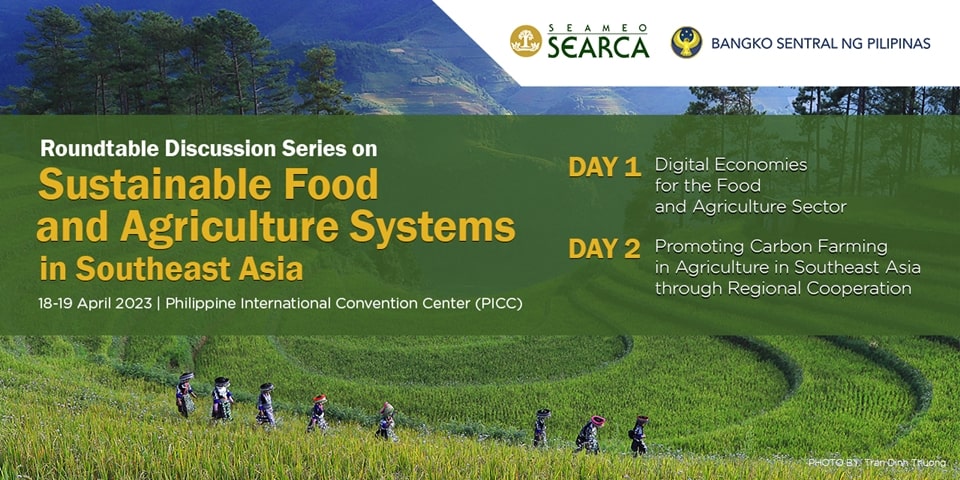 The Southeast Asian Regional Center for Graduate Study and Research in Agriculture (SEARCA), in partnership with the Bangko Sentral ng Pilipinas (BSP), will hold the “Roundtable Discussion Series on Sustainable Food and Agriculture Systems in Southeast Asia” from 18 to 19 April 2023 at the Philippine International Convention Center (PICC) in Pasay City. The event will be streamed live via Zoom and the official Facebook pages of the SEARCA and the BSP.