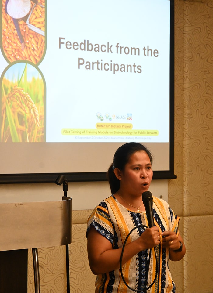 Aiming to strengthen provincial governments and enhance their knowledge to more effectively promote the use and acceptance of modern biotechnology, the Southeast Asian Regional Center for Graduate Study and Research in Agriculture (SEARCA) held the Pilot Testing of Training Module on Biotechnology for Public Servants on 30 September to 2 October 2024 at Acacia Hotel, Alabang, Muntinlupa City.