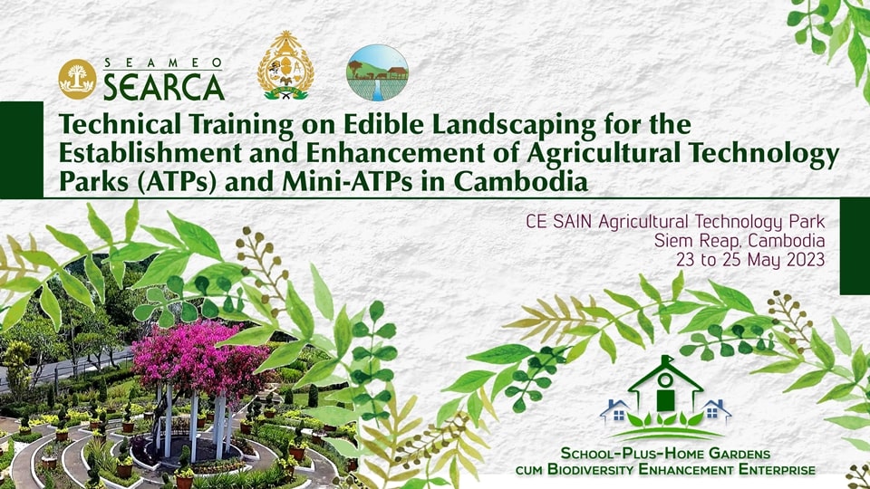 SIEM REAP, Cambodia—In pursuit of inspiring and motivating students about the science and art of crop production through school gardening, the Southeast Asian Regional Center for Graduate Study and Research in Agriculture (SEARCA) and the Center of Excellence on Sustainable Agricultural Intensification and Nutrition (CE SAIN) of the Royal University of Agriculture (RUA) will jointly conduct a technical training on edible landscaping to be held at CE SAIN Agricultural Technology Park (ATP), Siem Reap, Cambodia from 23 to 25 May 2023.