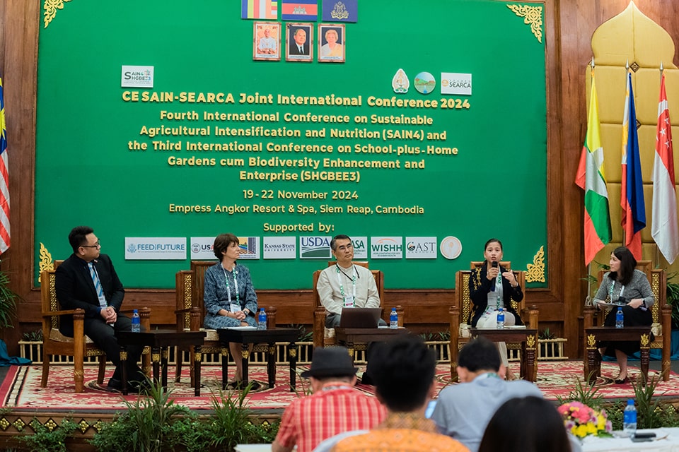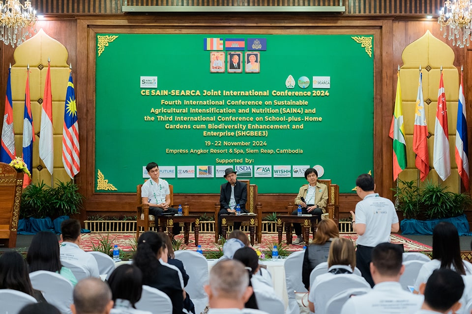 The Southeast Asian Regional Center for Graduate Study and Research in Agriculture (SEARCA), through its Research and Thought Leadership Department (RTLD), teamed up with the Center of Excellence on Sustainable Agricultural Intensification and Nutrition (CE SAIN) for the CE SAIN-SEARCA Joint International Conference 2024: The Fourth International Conference on Sustainable Agricultural Intensification and Nutrition (SAIN4) and the Third School-plus-Home Gardens cum Biodiversity Enhancement Enterprise (SHGBEE3) Conference held on 19–22 November 2024 in Siem Reap, Cambodia.