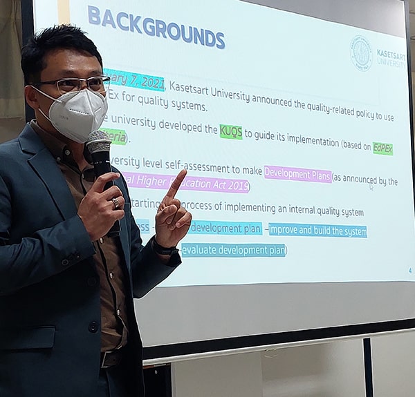 On the first day of the cross-visit, the participants visited KU's Bangkhen campus where Associate Professor Apichart Rodchanaworan, Assistant to the President for Quality Development, presented the University's Governance Structure and Quality Assurance System. Dr. Rodchanaworan pointed out that KU's Quality System Development Policy aims to implement quality throughout KU organizations towards "excellence" that strongly adheres to the Education Criteria for Performance Excellence (EdPEx). The EdPEx provides a framework and an assessment tool that could be used as a basis for developing an implementation model of a quality assurance system. According to Dr. Rodchanaworan, following the EdPEx framework has streamlined KU's policy to develop systematic approaches in working and finding solutions to problems, thus, contributing to improved quality of education and organizational sustainability.