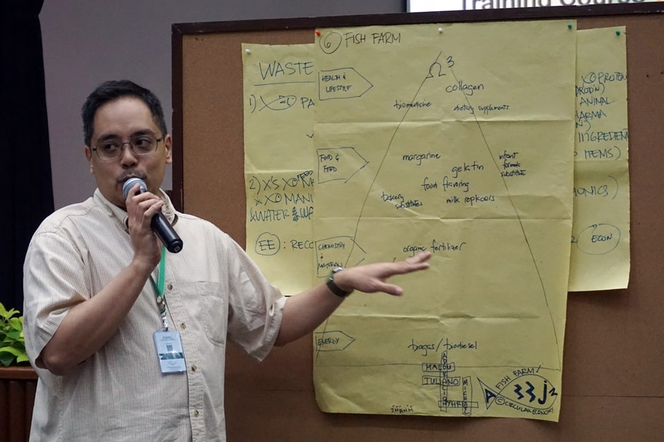 In the workshop, participants divided into seven groups worked on how to integrate the circular economy principles on their chosen agricultural sector/product. The groups presented the success factors, namely: enabling environment, market, technology, and raw materials, along with the product’s value pyramid design, to further illustrate the recycling and re-use of wastes in the production and consumption processes. The proposed circular economies were designed for fish, mango, carabao dairy products, coconut, and banana farms.