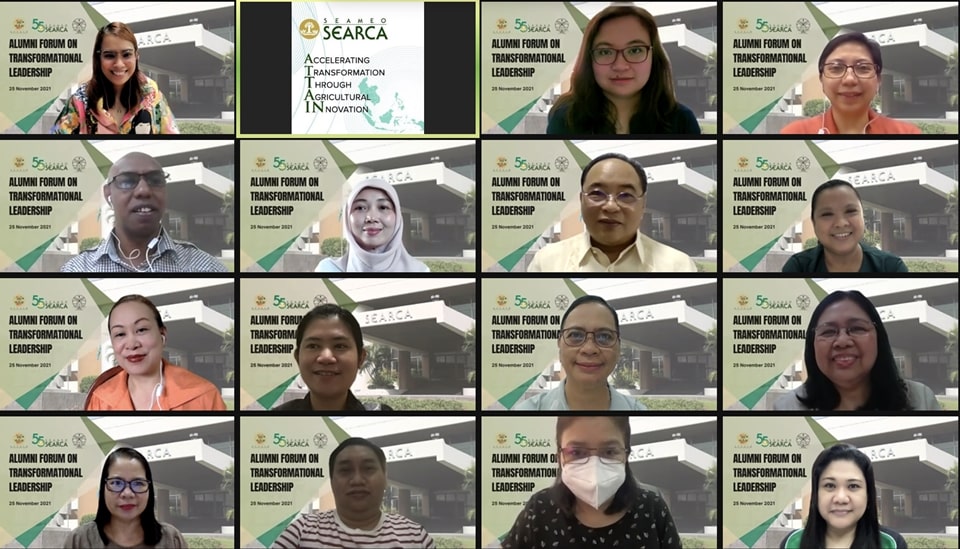 SEARCA, through the Graduate Scholarship and Institutional Development Unit (GSIDU) and the Regional SEARCA Alumni Association (RSAA), organized an Alumni Forum on Transformational Leadership on 25 November 2021. The forum celebrated SEARCA’s 55th Anniversary and discussed the experiences and reflections of selected SEARCA alumni on what it takes to be a transformational leader.