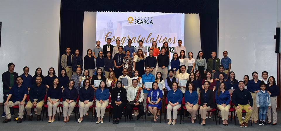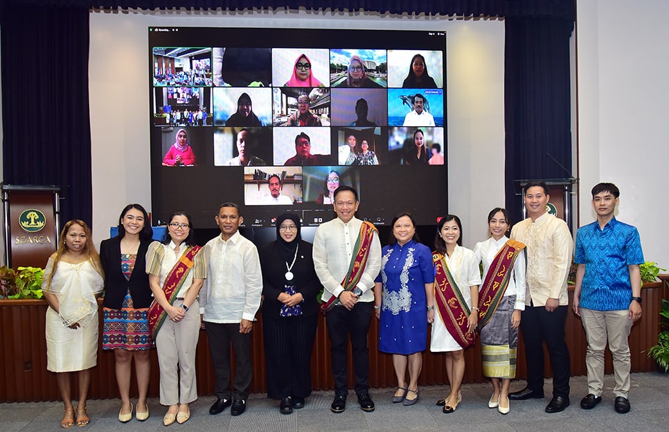 The Southeast Asian Regional Center for Graduate Study and Research in Agriculture (SEARCA) held a hybrid Testimonial Ceremony on 3 August 2023 to honor and celebrate the graduation of the Center's 28 Full MSc and PhD scholars and 6 PhD Research scholars. Out of the 28 full scholars, 11 were co-funded by SEARCA's partners, namely the German Academic Exchange Service or DAAD; National Taiwan University; Agropolis Fondation in France; and Tokyo NODAI and Nagoya University, both in Japan. The event was a joyous gathering attended in-person by eight graduating scholars together with their families while the rest of the honorees joined online. SEARCA staff and ongoing scholars witnessed the event.
