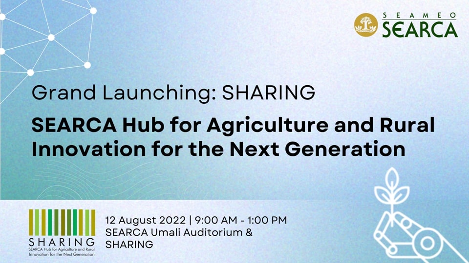 In celebration of the International Youth Day with the theme, “Intergenerational Solidarity: Creating a World for All Ages”, the Southeast Asian Regional Center for Graduate Study and Research in Agriculture (SEARCA) unveiled the SEARCA Hub for Agriculture and Rural Innovation for the Next Generation (SHARING) on 12 August 2022 via blended mode.