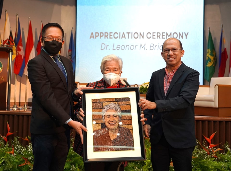 During the forum, Dr. Gregorio and Assoc. Prof. Joselito G. Florendo, SEARCA Deputy Director for Administration, also handed over a special token to Dr. Briones. The token is a rice mosaic portrait of the Education Secretary.