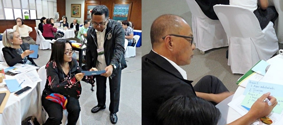 (Left picture) NEDA Region-X Regional Director Mylah Faye Carino discusses her answers with RRT Project Leader Dr. Arvin B. Vista. (Right picture) NEDA Region II Regional Director Dionisio Ledres, Jr. writes down Region 2’s priorities in the next five years.(Left picture) NEDA Region-X Regional Director Mylah Faye Carino discusses her answers with RRT Project Leader Dr. Arvin B. Vista. (Right picture) NEDA Region II Regional Director Dionisio Ledres, Jr. writes down Region 2’s priorities in the next five years.