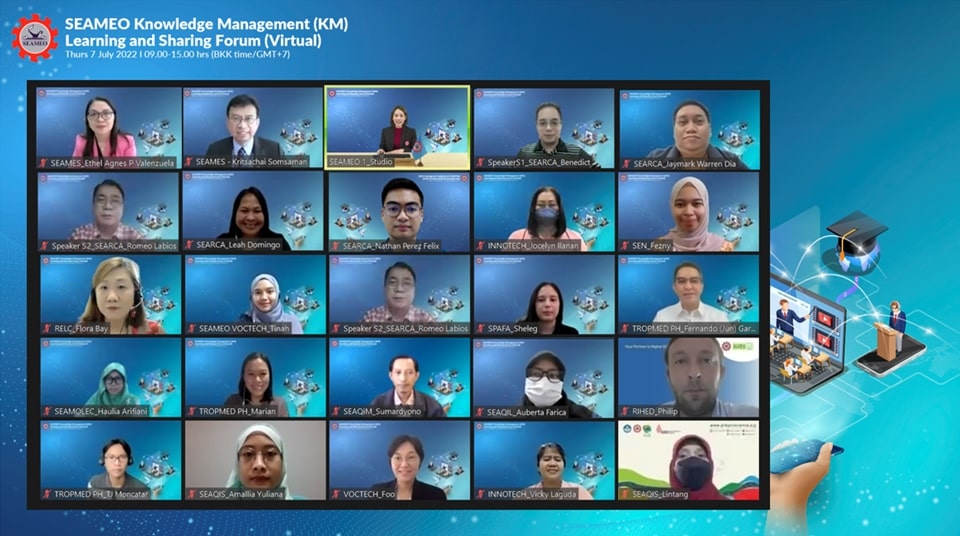 The Southeast Asian Regional Center for Graduate Study and Research in Agriculture (SEARCA) participated in the first virtual SEAMEO Knowledge Management (KM) Learning and Sharing Forum conducted by the Southeast Asian Ministers of Education Organization (SEAMEO) on 7 July 2022. The forum solicited suggestions for the SEAMEO-wide KM strategic framework that will enable the harmonious and logical flow of information and knowledge co-creation among SEAMEO centers in the Southeast Asian region.