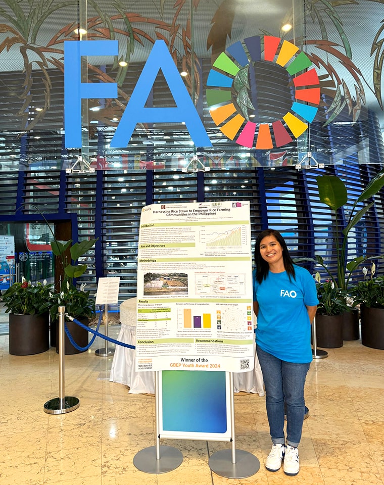 Rome, Italy – Engr. Czaneil Gomez, a Southeast Asian Regional Center for Graduate Study and Research (SEARCA) researcher, received the Food and Agriculture Organization (FAO) 2024 Youth Award for her invaluable contribution to sustainable and renewable energy through her research, "Harnessing Rice Straw to Empower Rice Farming Communities in the Philippines."