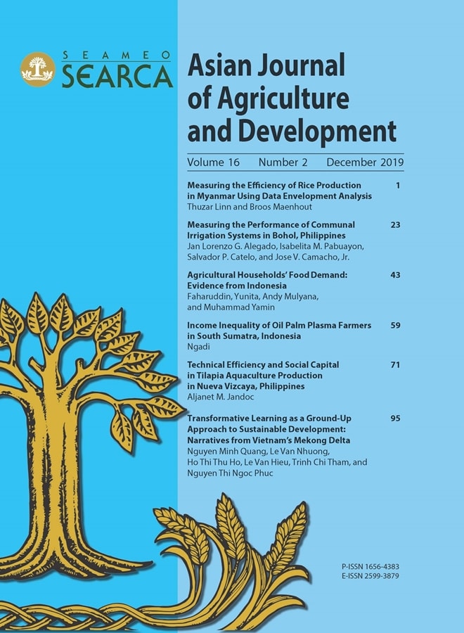 The latest AJAD issue, Volume 16 Number 2 published this December, features six papers authored by researchers from four countries. The first two measure performances: first is the rice production efficiency in Myanmar using data envelopment analysis, and the second is a Philippine paper focusing on communal irrigation systems. Two other articles tackle conditions in Indonesia, one discusses agricultural households' food demands, and the other is on income inequality of oil palm plasma farmers. Another Philippine paper studies the technical efficiency and social capital in tilapia production, while the final paper discusses a transformative learning ground-up approach to sustainable development in Vietnam's Mekong Delta.