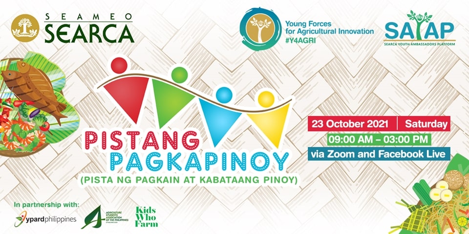 Bringing the spirit of fiesta to Filipino homes in the prevailing pandemic, SEARCA featured experts, advocates, and youth partners on food and agriculture at the 2021 Pista ng Pagkain at Kabataang Pinoy or “Pistang PagKaPinoy” on 23 October 2021 via Zoom and Facebook Live.