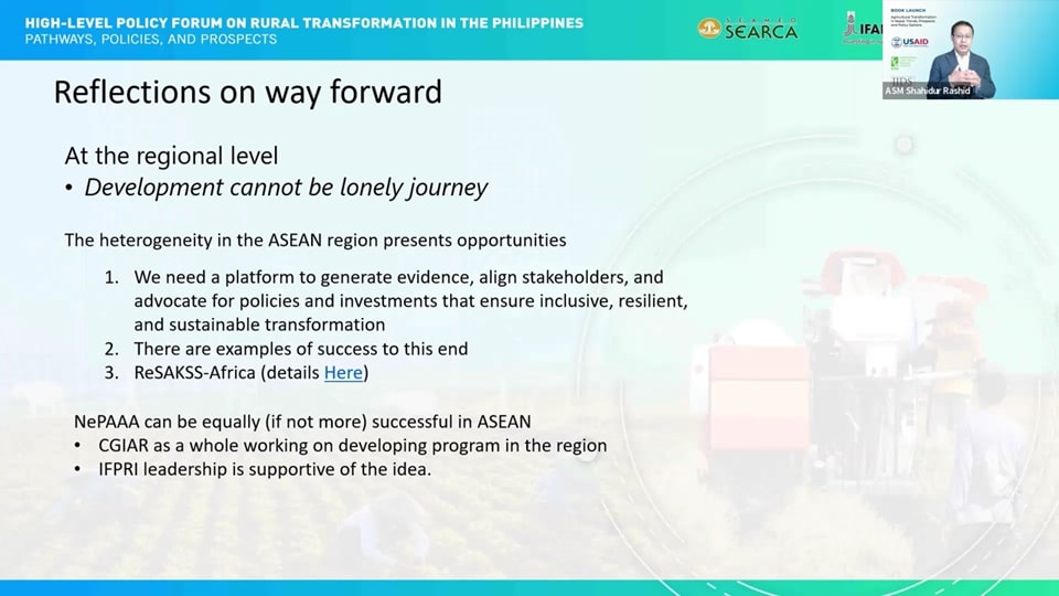 Following the NePAAA session, Dr. Shahidur Rashid, IFPRI Director-South Asia, synthesized the discussions during the two-day forum and summarized the reflections about the way forward of the activity. His talk elaborated on the concepts discussed, highlighted the state of transformation in the Philippines, and cited issues that had been and may be faced by policymakers and policy development practitioners.