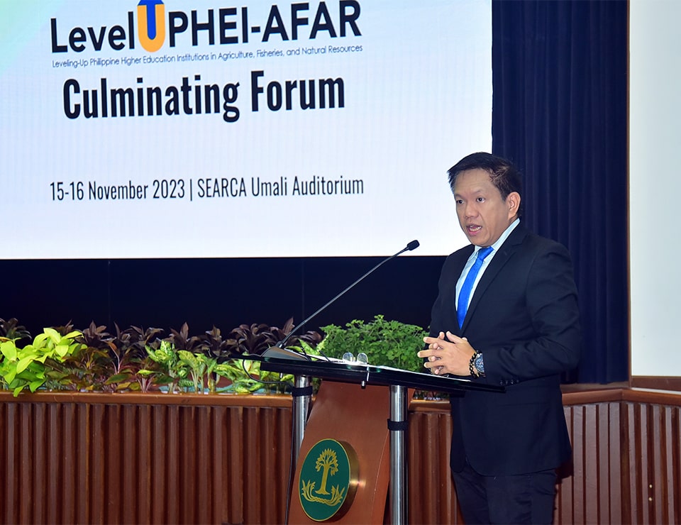 Assoc. Prof. Joselito G. Florendo, Deputy Director for Administration of SEARCA, welcomed the delegates to the Culminating Forum of the LevelUPHEI AFAR project.Assoc. Prof. Joselito G. Florendo, Deputy Director for Administration of SEARCA, welcomed the delegates to the Culminating Forum of the LevelUPHEI AFAR project.Assoc. Prof. Joselito G. Florendo, deputy director for Administration of SEARCA, expressed gratitude to SUC-ACAP and CHED for their pivotal role in propelling faculty members toward enhanced relevance and competitiveness in the 21st century through international programs. He also extended SEARCA's profound appreciation to the UC members for their gracious hosting of all grantees. Their hospitality has enriched the grantees' experiences and became a bridge for cultural exchange.
