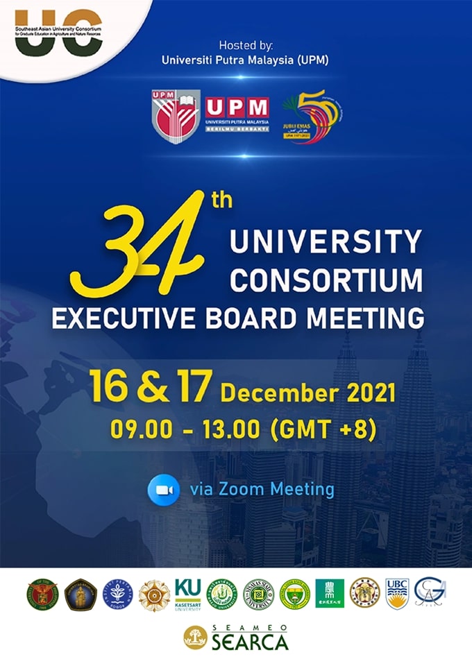 The Southeast Asian University Consortium for Graduate Education in Agriculture and Natural Resources (UC) will hold its 34th UC Executive Board Meeting online on 16-17 December 2021, hosted by Universiti Putra Malaysia (UPM) in Serdang, Selangor, Malaysia. The Consortium is anticipating the virtual attendance of representatives from its Regular Members, Kasetsart University (KU), Universitas Gadjah Mada (UGM), IPB University (IPB), University of the Philippines Los Baños (UPLB), and Universitas Brawijaya (UB). Also attending the board meeting are the two UC Associate Members, Tokyo University of Agriculture (Tokyo NODAI) and National Taiwan University (NTU), and Affiliate Member, University of British Columbia (UBC).