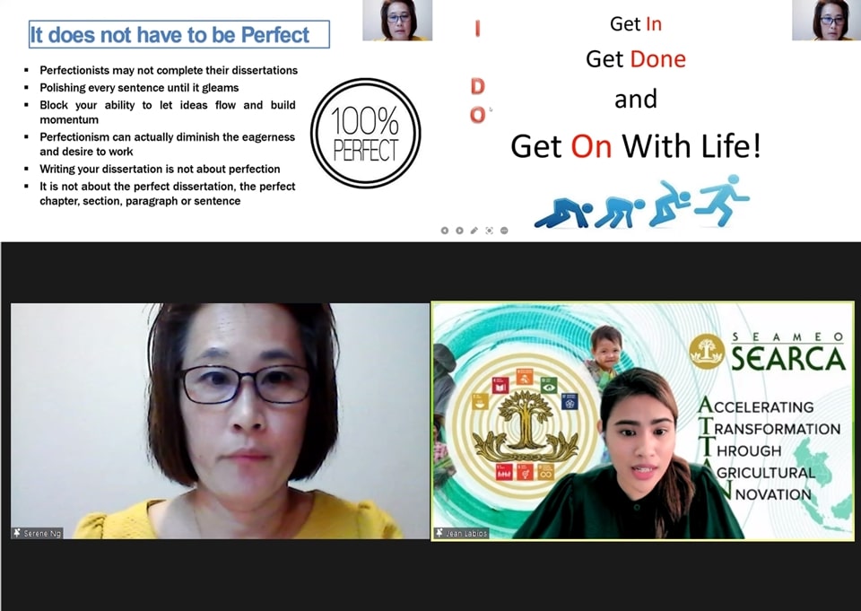 The Education and Collective Learning Department (ECLD) of SEARCA organized the 3rd GSID Conversations on 27 May 2022 (Friday), 10:00 AM (GMT +8:00) to specifically tackle how scholars can navigate their postgraduate studies. The webinar is part of the scholarship package provided by the Center which includes academic and extracurricular learning events that serve as tools for the scholars to complete their academic requirements and support their social well-being. Dr. Ng Siew Imm, Associate Professor at the School of Business and Economics and Associate Editor of the International Journal of Economics and Management, Universiti Putra Malaysia, served as guest speaker for the event and provided expert advice on managing the scholars’ academic journey towards graduating on time.