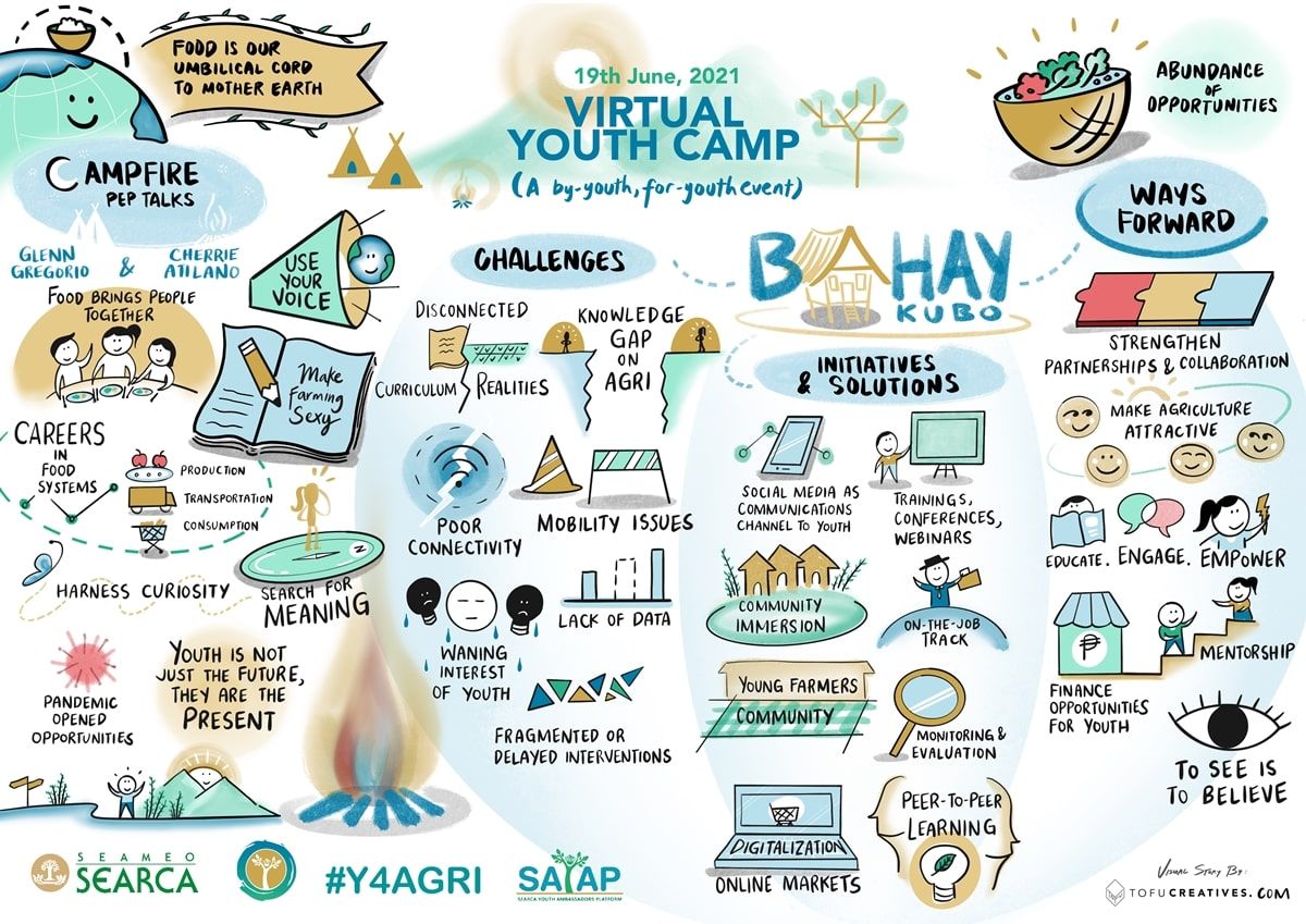 The Virtual Youth Camp is designed to enable youth perspectives on challenges and solutions in the agri-food system amidst and post-pandemic. On the first VYC, there were 21 Filipino youth representatives from the academe, business, civil society, and government sectors who shared insights on navigating the agri-food system and engaging the youth on it.
